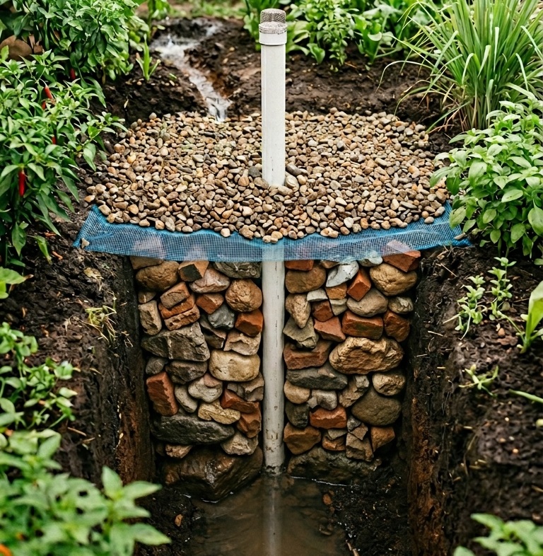 ชั้นกลางใส่ หินกรวดหรือเศษอิฐให้เต็มพื้นที่รอบท่อ PVC