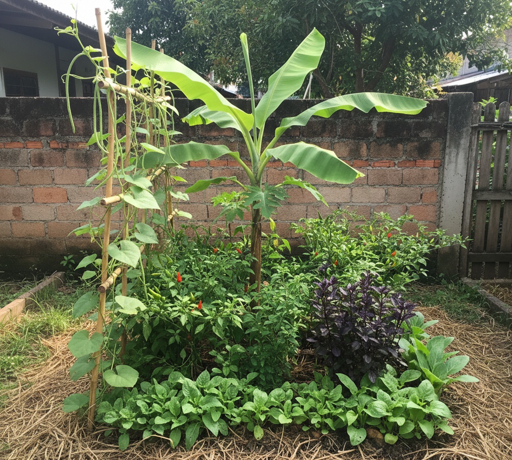- ชั้นบน (ไม้ประธาน) เลือกไม้ผลที่ให้ร่มเงา เช่น มะละกอ กล้วย หรือส้มโอ โดยปลูกตรงกลางหลุม