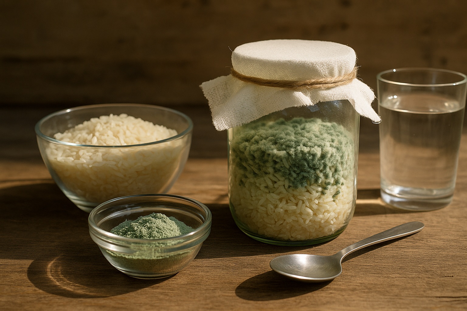 1. เตรียมอาหารเชื้อ โดยนำข้าวสาร 100 กรัม ใส่ภาชนะ เติมน้ำสะอาดประมาณ 200 มิลลิลิตร แช่ทิ้งไว้ 4-6 ชั่วโมงจนข้าวพองตัว
