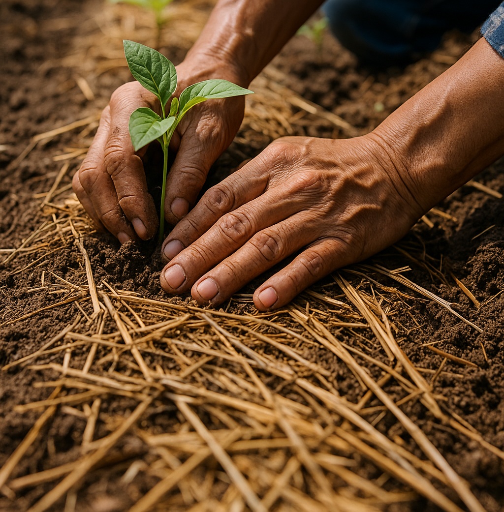 2. คลุมดินด้วยวัสดุธรรมชาติ เช่น ฟาง ใบไม้ แกลบดำ หรือเศษหญ้า ช่วยเก็บความชื้น ลดวัชพืช และเพิ่มอาหารให้จุลินทรีย์ในดิน