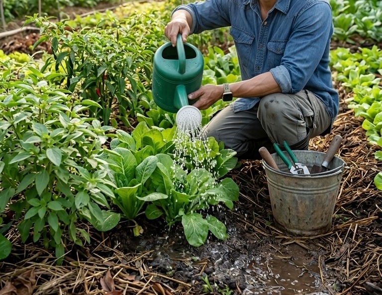 2. ข้อควรระวังเรื่องเชื้อรา การรดน้ำในช่วงเย็นมีความเสี่ยงสูงหากใบไม้เปียกชื้นข้ามคืน ควรใช้เทคนิคการรดที่โคนต้นโดยตรง หลีกเลี่ยงการฉีดพ่นละอองน้ำโดนใบ เพื่อไม่ให้เกิดสภาวะชื้นแฉะ ซึ่งเป็นสาเหตุหลักของโรครากเน่าและราน้ำค้าง