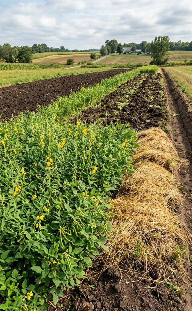 เมื่อพืชตระกูลถั่วเริ่มออกดอก หรือซากต้นพืชเดิมเริ่มแห้ง ให้ไถกลบลงไปในดินทันที ห้ามเผาทิ้งเด็ดขาด เพราะซากเหล่านี้จะกลายเป็นอาหารของจุลินทรีย์และกลายเป็นปุ๋ยอินทรีย์ที่ช่วยให้ดินฟู นุ่ม และอุ้มน้ำได้ดีขึ้นในระยะยาว