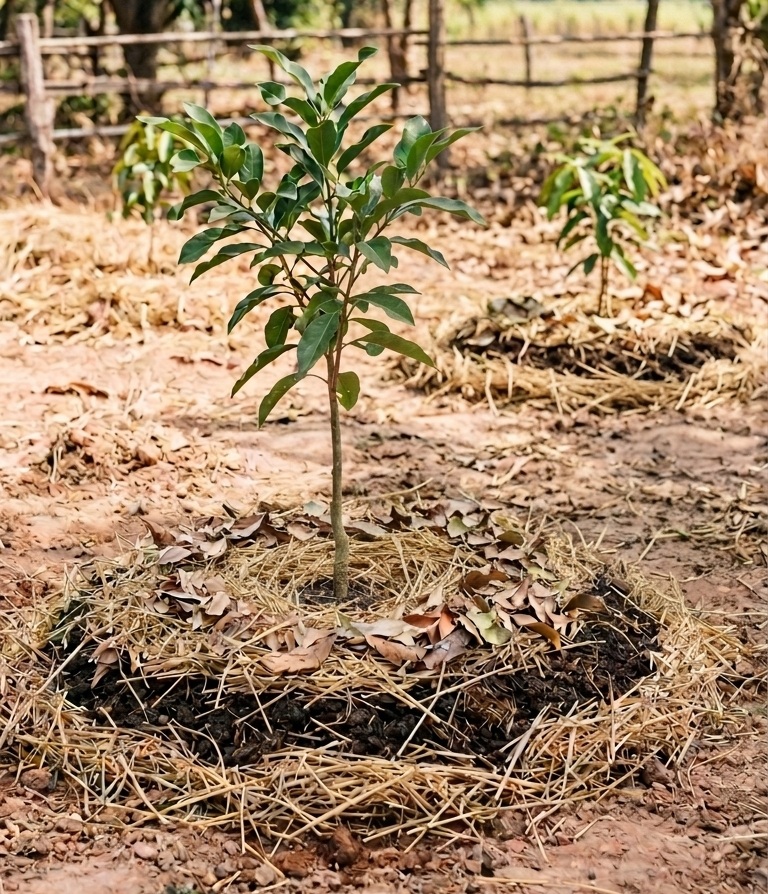 ชั้นที่ 1. “ห่มด้วยอินทรียวัตถุ” โดยนำฟางหรือหญ้าแห้งมาคลุมรอบโคนต้นไม้ เว้นระยะห่างจากลำต้นประมาณ 1 คืบ เพื่อป้องกันเชื้อราและแมลง คลุมให้กว้างเท่าทรงพุ่ม หนาประมาณ 1-2 นิ้ว ชั้นนี้จะทำหน้าที่เป็น ฉนวนกันความร้อนจากแสงแดด