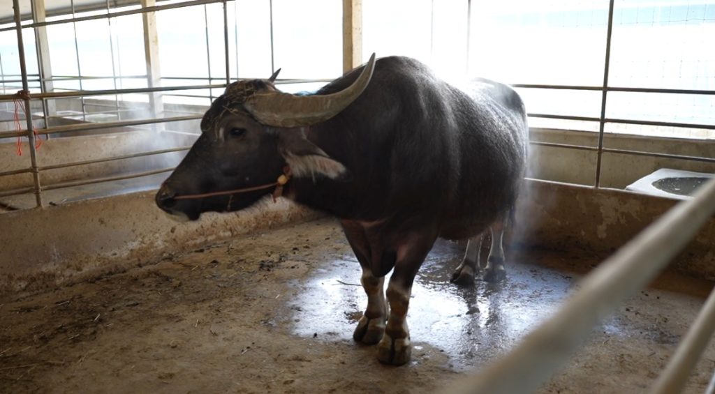 อีกหนึ่งมาตรการดูแลสุขภาพควายคือการ ติดตั้งระบบสปริงเกอร์ เพื่อให้ความชุ่มชื้นทดแทนการนอนปลัก ควายจะได้รับน้ำผ่านสปริงเกอร์ทุก 1 ชั่วโมง ครั้งละ 15 นาที เริ่มตั้งแต่เวลา 09.00 น. หลังจากทำความสะอาดคอกเสร็จ นอกจากนี้ ฟาร์มยัง ติดตั้งกล้องวงจรปิด เพื่อเฝ้าดูแลความเป็นอยู่ของควายตลอดเวลา