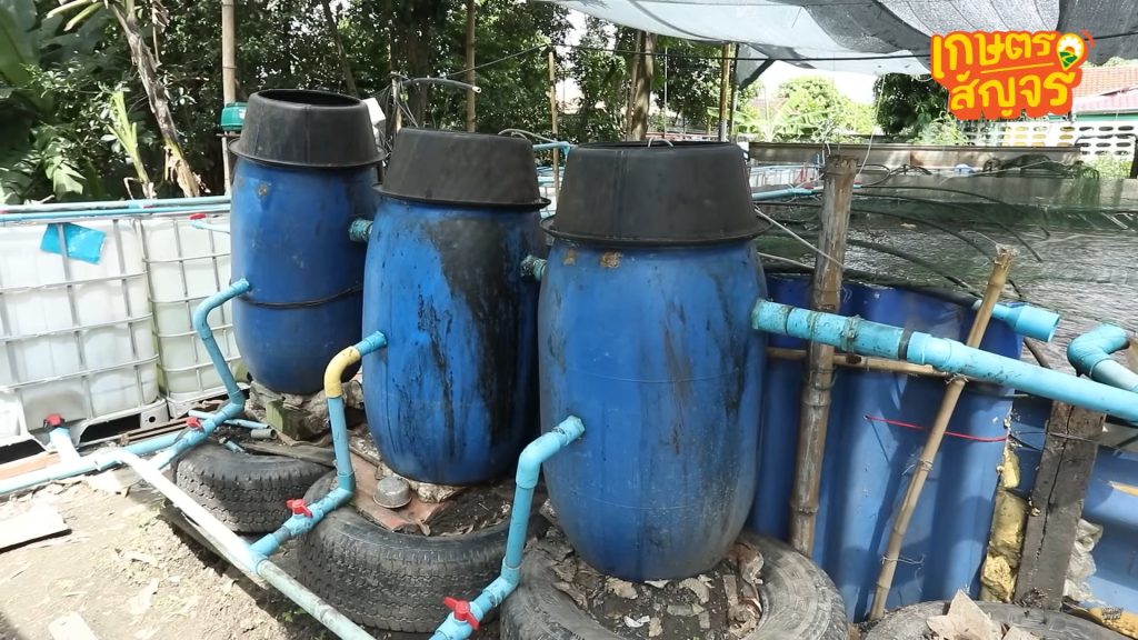 สำหรับการกรองน้ำ ฟาร์มจะทำระบบกรองเอง โดยใช้ ถังพลาสติกบรรจุใยอวนเก่า สแลน และไบโอบอล แบ่งเป็น 3 ถัง ได้แก่ กรองหยาบ กรองกลาง และกรองละเอียด น้ำจากบ่อจะถูกดูดเข้ามาผ่านการกรองและหมุนเวียนกลับไปในบ่อแบบระบบน้ำวน ในระบบน้ำจะมีการเติม กากน้ำตาล เพื่อช่วยดูดซับของเสียและกระตุ้นการทำงานของจุลินทรีย์ เนื่องจากการเลี้ยงปลาดุกแบบหนาแน่นทำให้เกิดของเสียมาก จึงต้องจัดการทั้ง การกรอง การหมุนเวียนน้ำ และการจ่ายอากาศให้เพียงพอ รวมถึงการใช้พื้นที่อย่างคุ้มค่า เพราะข้อจำกัดของพื้นที่ต้องการการบริหารจัดการอย่างมีประสิทธิภาพ