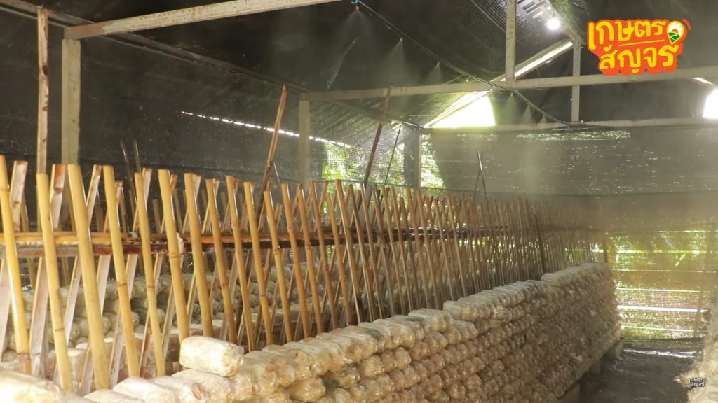 สำหรับฟาร์มที่ใช้ โรงเรือนระบบ EVAP จะมีการ รดน้ำเพียงวันละ 1 ครั้ง ในช่วงเวลา ประมาณ 2 ทุ่ม โดยระบบจะปล่อยน้ำผ่านท่อบริเวณหลังคา เพื่อให้ละอองน้ำกระจายทั่วโรงเรือนอย่างสม่ำเสมอ ช่วยรักษาระดับความชื้นที่เหมาะสมให้กับก้อนเห็ดตลอดทั้งคืน ข้อดีของโรงเรือนระบบ EVAP คือสามารถ ควบคุมสภาพแวดล้อมได้ดี ทำให้เห็ดออกดอกได้ทุกวันอย่างต่อเนื่อง ต่างจากโรงเรือนแบบธรรมดาที่ต้อง อาศัยสภาพอากาศภายนอก และจำเป็นต้องรดน้ำถึงวันละ 3–4 ครั้ง โดยเฉพาะในช่วงที่อากาศร้อนจัด