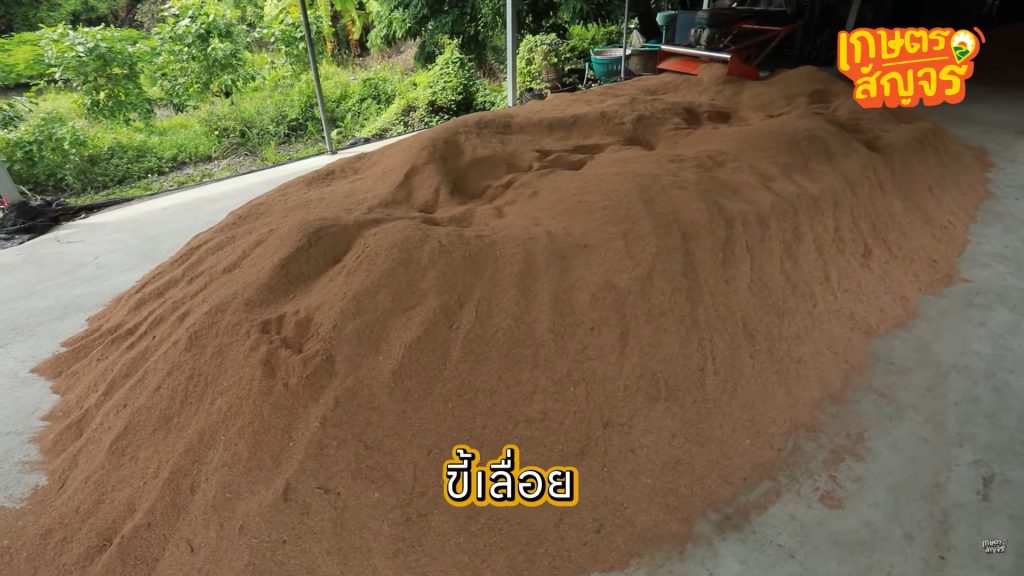 หัวใจสำคัญของการทำก้อนเชื้อเห็ดคือ “ขี้เลื่อย” ซึ่งฟาร์มเลือกใช้ขี้เลื่อยจากไม้ยางพาราเป็นหลัก เนื่องจากมีคุณสมบัติที่เหมาะกับการเจริญเติบโตของเชื้อเห็ดและสามารถดูดซับความชื้นได้ดี โดยขี้เลื่อยจะถูกสั่งตรงมาจากภาคใต้ ครั้งละประมาณ 18 ตัน แล้วนำมากองพักไว้เพื่อรอเข้าสู่กระบวนการผสม