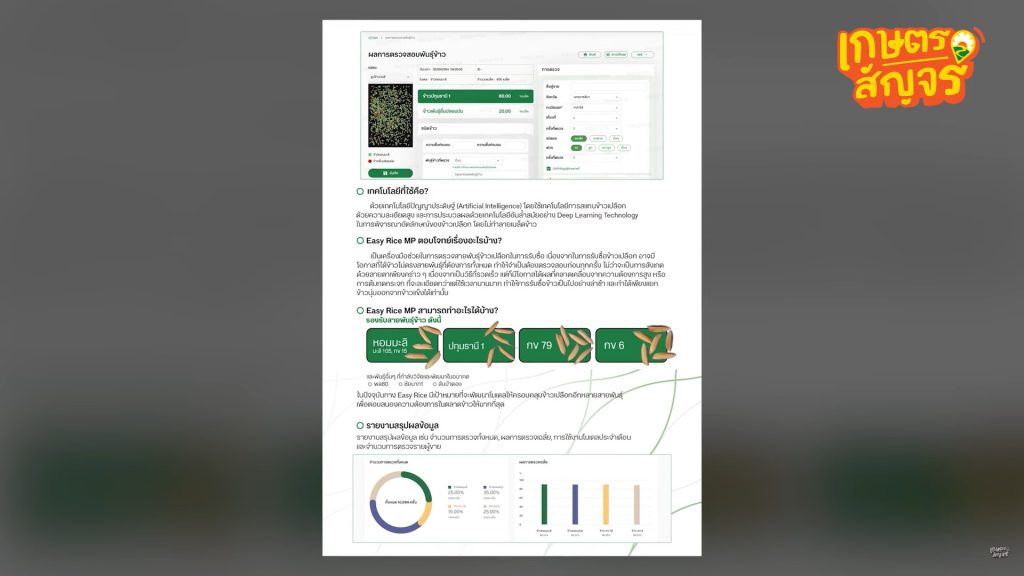 หัวใจสำคัญของความแม่นยำอยู่ที่ระบบ AI ซึ่งใช้ข้อมูลภาพและลักษณะทางกายภาพของเมล็ดข้าว เช่น รูปร่าง ขนาด สี และพื้นผิว มาเปรียบเทียบกับฐานข้อมูลของสายพันธุ์ที่ถูกฝึกไว้ ทำให้สามารถระบุสายพันธุ์ข้าวและสัดส่วนการเจือปนได้อย่างมีมาตรฐาน ลดความคลาดเคลื่อนจากการประเมินด้วยสายตาของมนุษย์ เมื่อใช้เทคโนโลยีนี้จึงช่วยให้การตรวจสอบคุณภาพข้าวมีความน่าเชื่อถือมากขึ้น